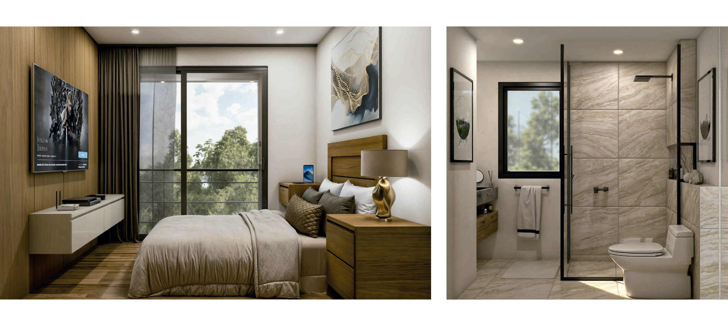 Las recámaras ofrecen paz, la luz natural llena el espacio y se fusiona con las vistas del exterior. Las dos recámaras secundarias cuentan con balcones para disfrutar del aire fresco y limpio que da Zona Esmeralda.